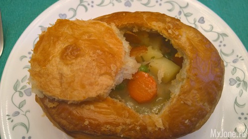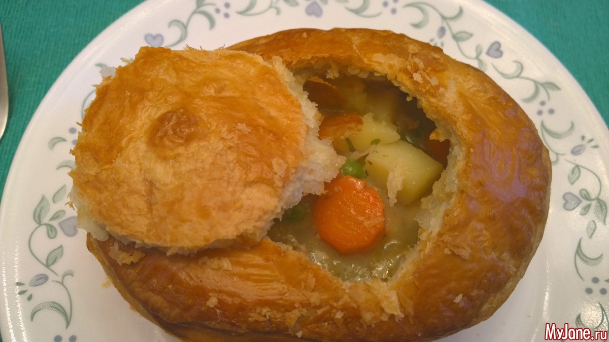 там было 4 ст.л. сливочного масла, растопить и туда 4 ст.л. муки. сделать кашицу и с минуту прожарить чтоб убрать вкус муки. добавить 2 стакана куриного бульона. наша подлива загустеет. она должна обволакивать тонким слоем ложку если ложку в неё окунуть. у меня ушло около 3х стаканов для нужной консистенции. туда же 3 ст.л. жирных сливок. 4 куриные готовые куриные грудки (я запекала в духовке со специями) нарезать на куски, 250 гр моркови нарезать кругляшами, 250 гр карошки кубиками и 0.5 стакана горошка свежего или мороженого в подливу. посолить и добавить специй по вкусу. овощи обварить в подливе 3-5 минут. полностью остудить - примерно час в холодильнике. слоёное тесно вырезаем по форме горшочка. в горшочек подливу с овощами и курой. края горшочка обмазать взбитым яйцом положить слоёное тесто чтоб оно касалось смазанных краёв и немного прижать к краям чтоб прилипло. сверху тесто смазать яйцом и в духовку 180 цельсия минут на 25-35. лучше на 35 чтоб овощи полностью пропеклись.