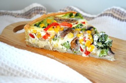 3. Подготовить овощи для начинки: отварить замороженную брокколи, разделить на соцветия. Порезать перец, шампиньоны. Смешать всё с кукурузой. Овощи распределить на тесте.