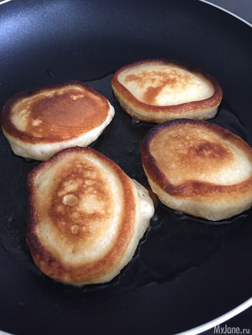 Беру чашку, туда одно или два яйца, щепотку соли и сахар по вкусу - ложки три я кладу. Все взбиваю. Потом туда вываливаю банку натурального йогурта. Можно квашенное молоко. Мешаю как надо. Потом беру столовую ложку, набираю в неё хороших пол чайных ложки соды и все это дело аккуратно гашу уксусом. В тесто. Помешала и пусть минутку-две постоит. Потом добавь муки - тесто как жидкая манная каша. И жарь на растительном масле. Но не на сильном огне! Иначе они все сгорят, а внутри будут сырыми. Спокойный огонёк и спокойненько жаришь!