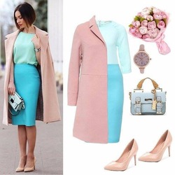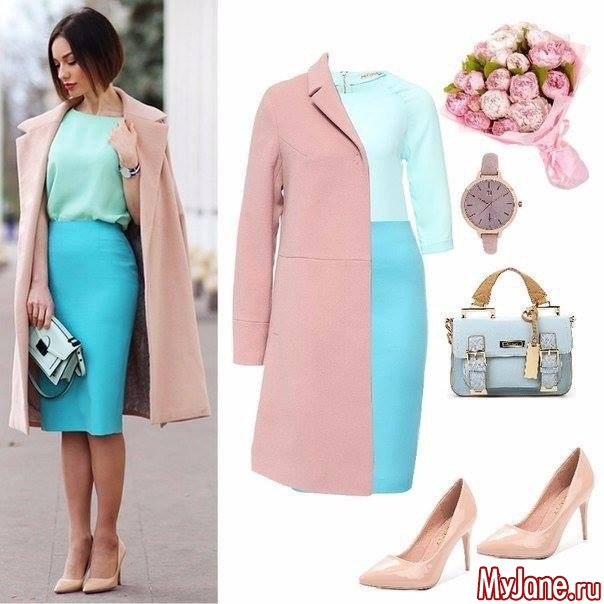 Визуально воспринимается отношение либо 2/3, либо 3/5, либо 5/8 ну и так далее. Так что здесь будет зависеть от того, как модель будет носить этот комплект. Совсем застегнёт пальто - замечательно - брюнетке очень идёт серо-розовый. Снимет его - тоже ярко получится - бирюзовый и голубой хорошо оттенят кожу. Но вот нараспашку - излишек цвета, либо нужно перебить фиолетовым (к часам добавить что-то ещё: сумку, ну, не знаю, вышивку на пальто, аппликацию какую-нибудь, платок шейный)