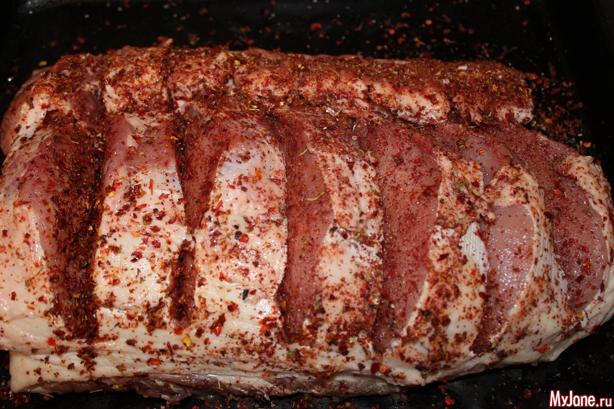На противень (я его ни чем не смазываю, лишь ополаскиваю водой) выложить мясо, сделать в нем надрезы - кармашки, но не прорезать до конца. Смешать специи и соль, смазать мясо, оставить минут на 10-15.