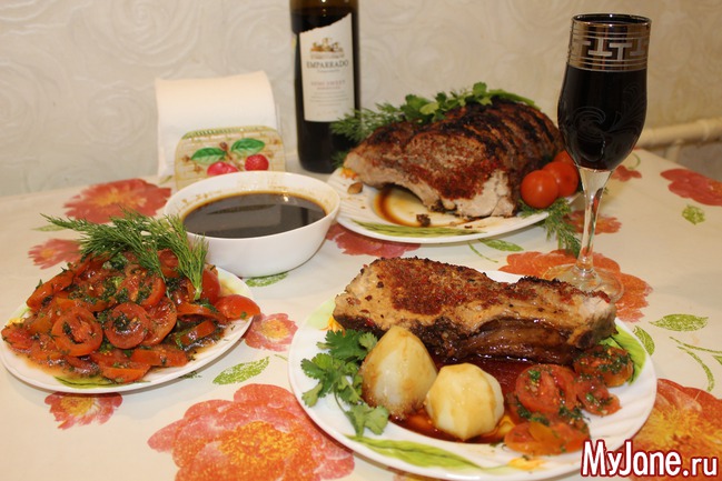 Мясо выложить на тарелку, оставшийся на противне соус (вино) слить. Мясо разделить порционно и полить соусом. Приятного аппетита!!!