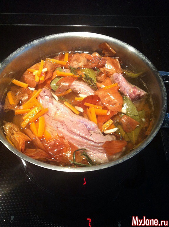 Как вода закипит в кипящую опустить мясо и на медленном огне под закрытой крышкой варить 1,5 часа. (Готовый продукт будет мягким - на нож).