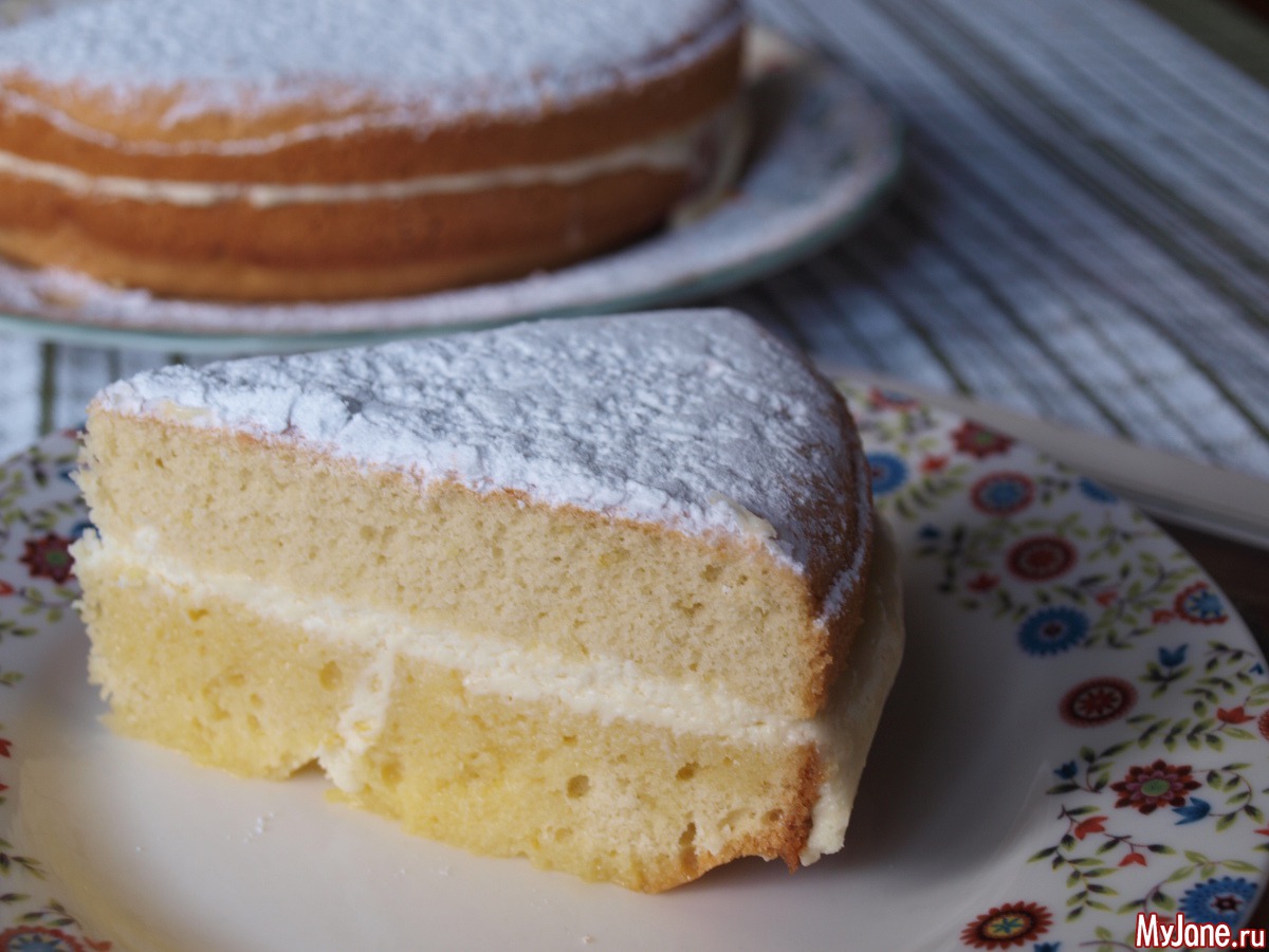5. собираем торт: готовый бисквит остудить, разрезать поперек на две половинки. смазать нижний слой лимонным курдом, затем сметанным кремом, накрыть второй половиной бисквита, посыпать торт сахарной пудрой и оставить на пару часов пропитаться.