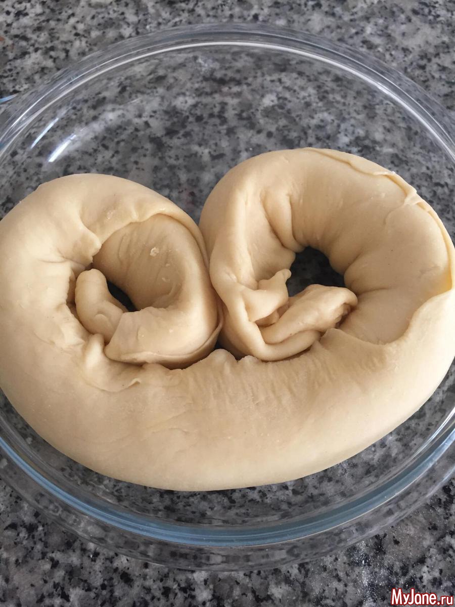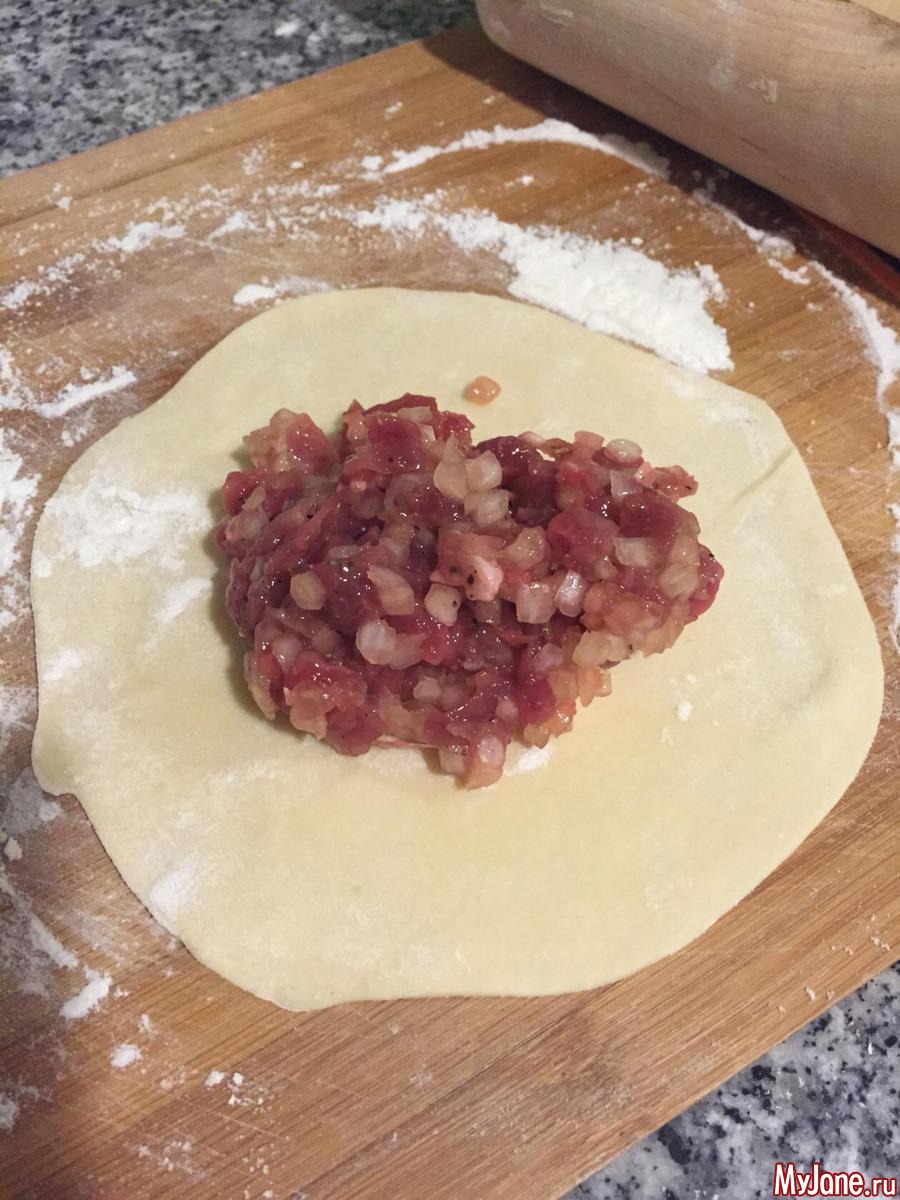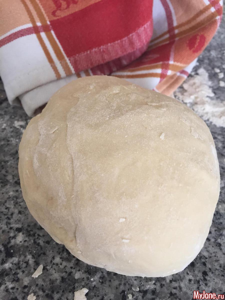 Тесто делается как на пельмени, но не такое крутое. На пол-порции Пол-стакана воды, 1 яйцо (смешай его отдельно, часть в тесто и сразу оставь немного для помазать сверху), щепотку соли и муки, сколько примет. Но я добавляю грамм 50 растопленного маргарина в воду, перед мукой. Замесила не сильно круто и пусть отдыхает. Я кладу под переверную чашку, в которой замешивала, не меньше, чем на час. Пару раз за это время обминаю.