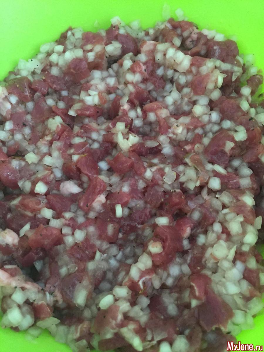 Фарш у меня баранина. Лука столько же сколько и мяса. У меня 400 гр и 400 гр. Мясо я очень мелко порезала ножом, добавила лук, соль, перец и зиру (кумин). Все хорошо перемешала и поставила в холодильник.
