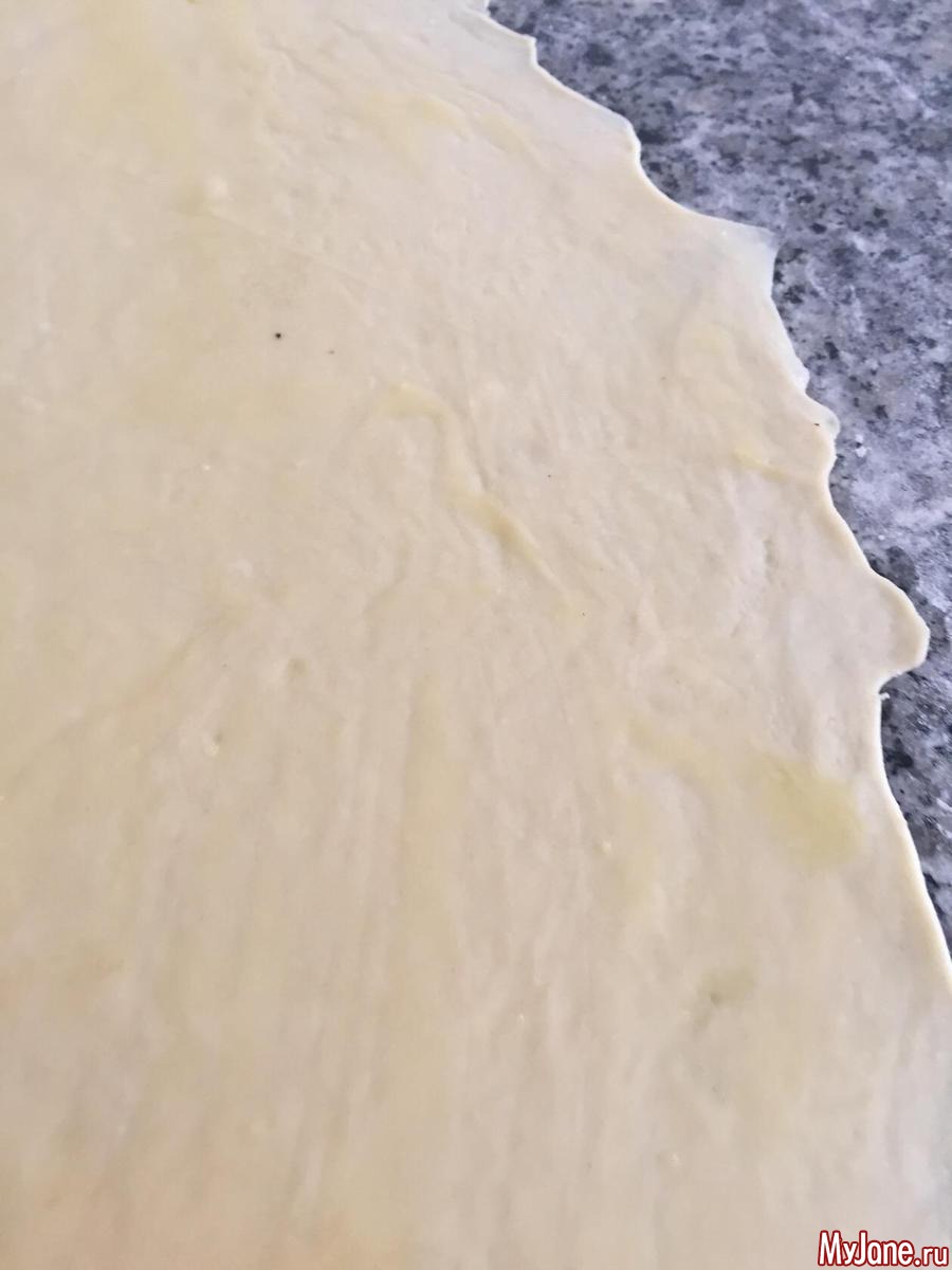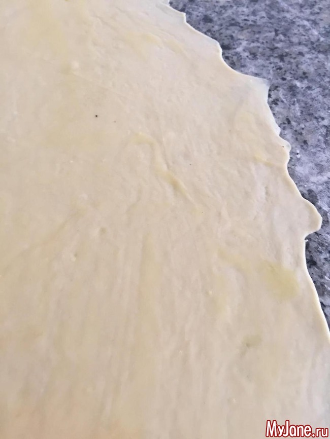 - раскатанный пласт теста очень хорошо смазать растопленным маргарином (хозяйки используют ещё курдючный жир для этого) - тогда будут хорошие слойки - при раскатке в дальнейшем должны прямо видны быть кружочки - как у спиленного дерева!