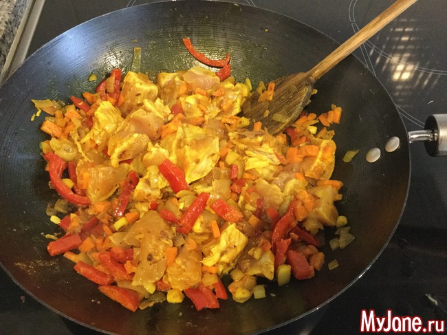Я кидаю все овощи сразу вместе. Вообще все, и чеснок тоже. А потом в самом конце могу чесночка чуть подкинуть.