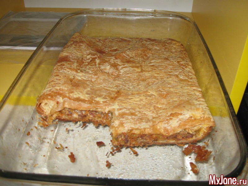 У дочки спрашиваю - что с ней сделать, выбрасывать жалко. Дочка говорит - пирог с капустой и рулядой. Не вопрос. Все ингредиенты в наличии, в том числе и замороженое слоеное тесто. Чуть чуть возни (тесто дольше размораживалось) - и получилось вот что: