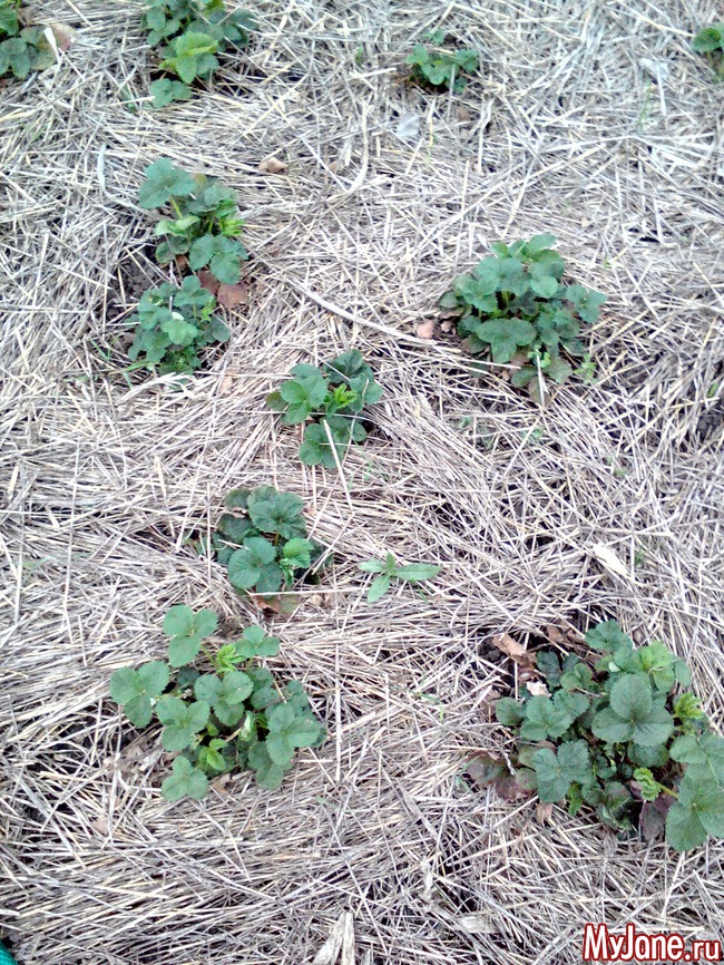 Клубника с осени с головой засыпанная соломой и покошенная перед этим