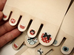 По сути это обычные эластичные колготки прозрачного цвета, носок которых разделён на пальчики. В свою очередь на каждом пальчике закреплена наклейка, которая имитирует накрашенный ноготь. Довольно изобретательно.