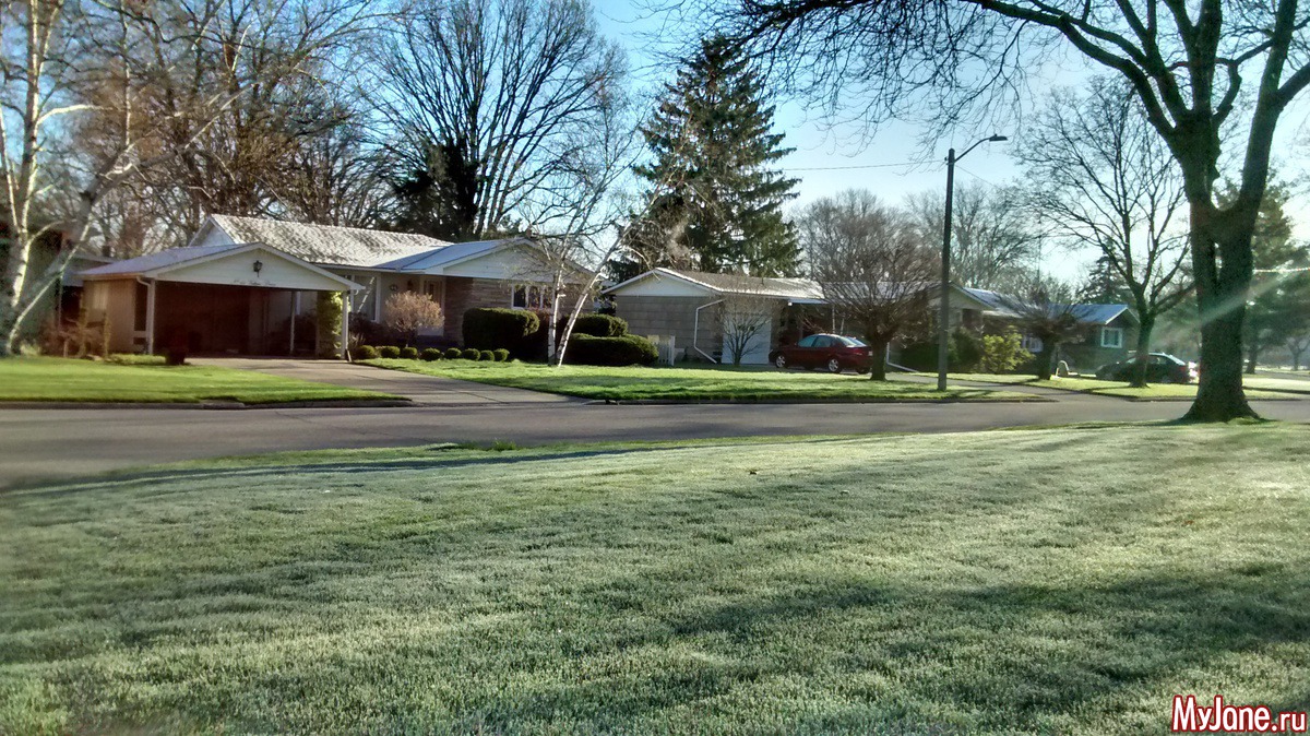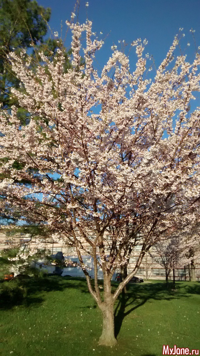 Надо же как красиво - вишня с цветочками и иней на газонах!
