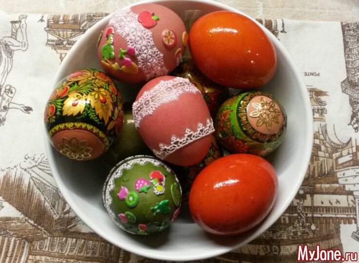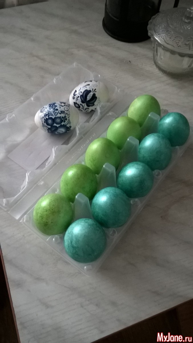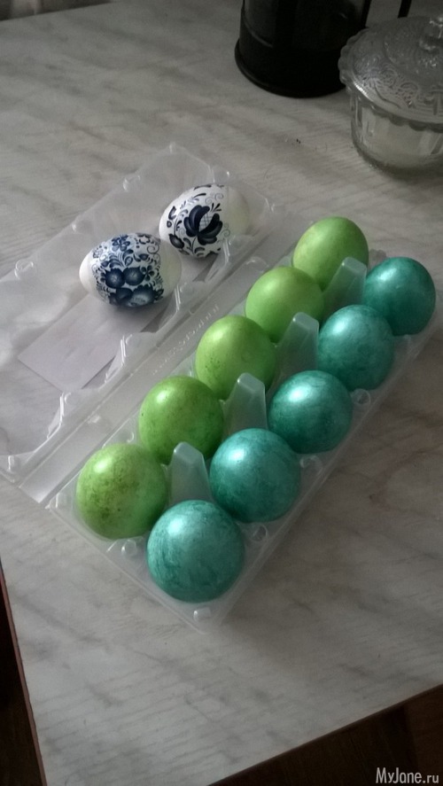 У нас обычные яйца шести цветов, Коля на них наклейки клеил. Выглядит странно, потому что я мелкие наклейки купила, Коля наклеил по три штуки на каждое яйцо, а больше клеить запретил