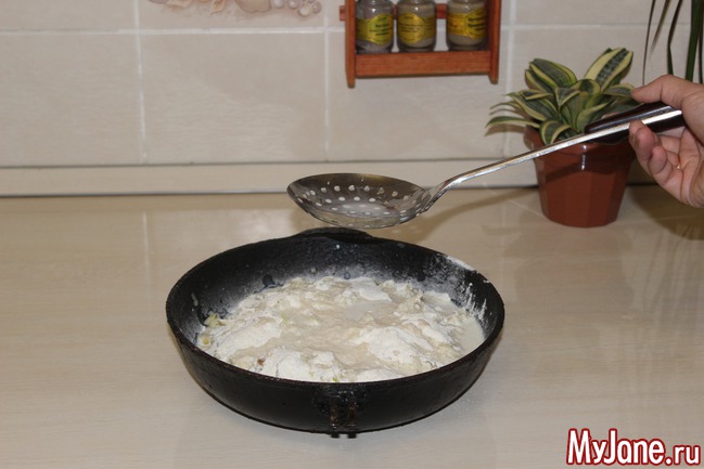 Сверху с помощью шумовки залить молоком, стараясь чтобы вся поверхность была залита. Если немного осталось сухим, полить ложкой.