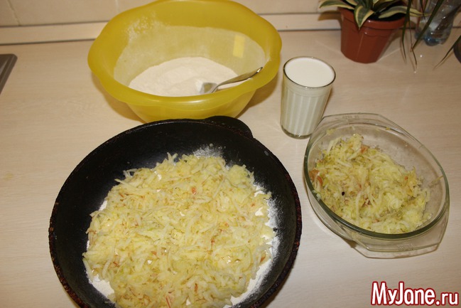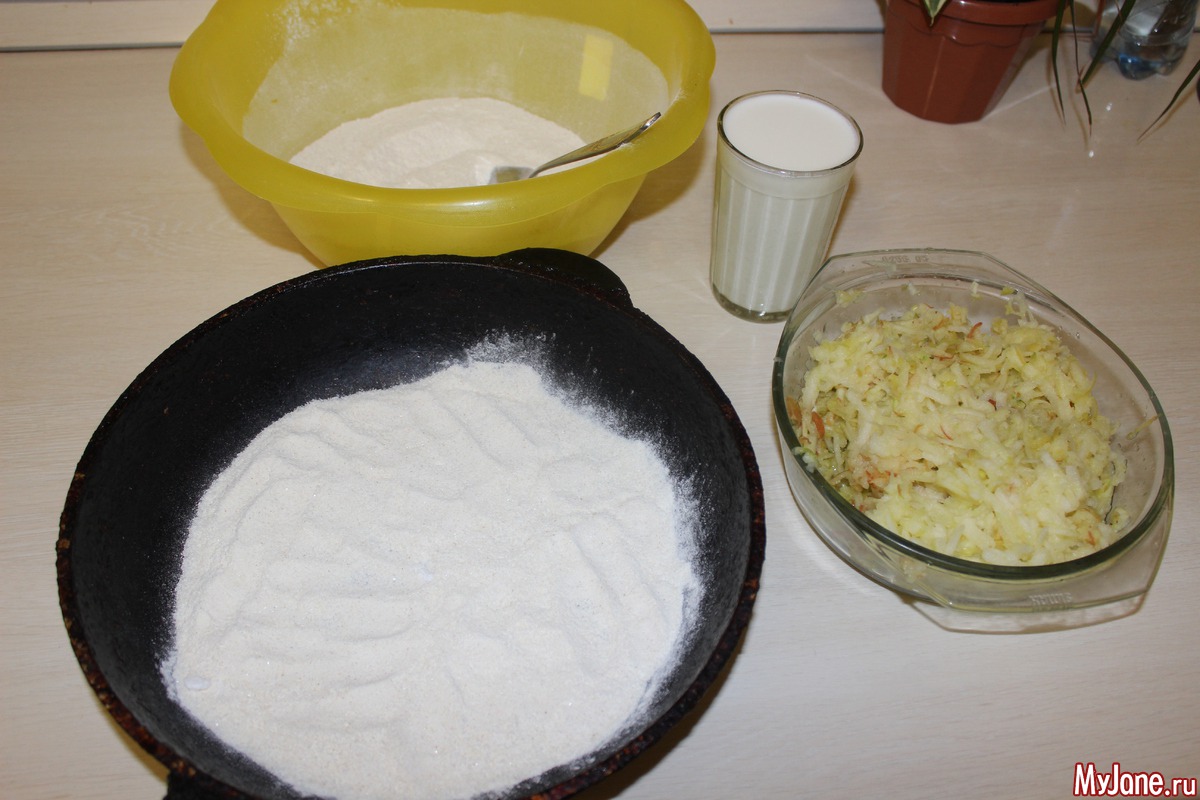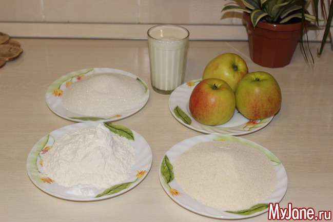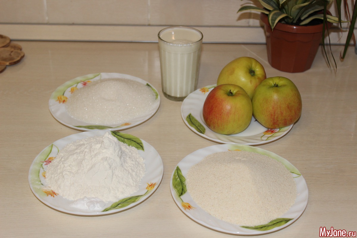 Муку, сахар, манку, соду перемешать, яблоки натереть на крупной терке.