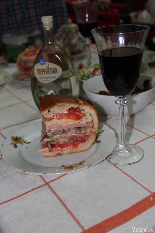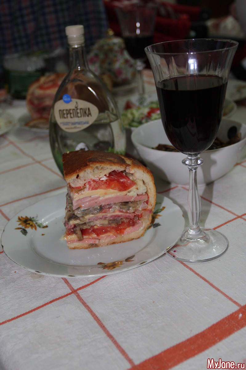С хлебы срезается верхушка. Вынимаем оттуда мякоть. И далее слоями все укладываем. Муж сыр последний раз пластом клал. Но мне кажется лучше, чтоб он таял его натереть на терке. Крышку из хлеба кладем сверху. Много майонеза тоже смысла нет класть, мы делали только 1 слой. В оригинале рецепта, еще и сверху всего хлеба сыр и копченая колбаса, но ИМХО это совсем лишнее.
