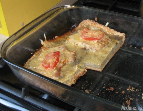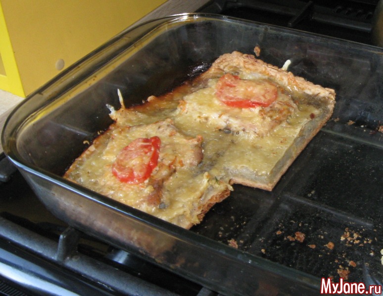 У меня был совсем небольшой кусочек мяса для отбивных, из него только 6 штук получилось. Поэтому я раскатала слоеное тесто, на него выложила слой сырой тертой картошки с солью и приправами, картошку помазала сметаной. На картошку - мясо. Закрыла сверху фольгой, поставила в духовку запекаться. Когда увидела, что мясо готово, выложила на него помидоры и сыр. Запекала уже открытым. Всем очень понравилось!