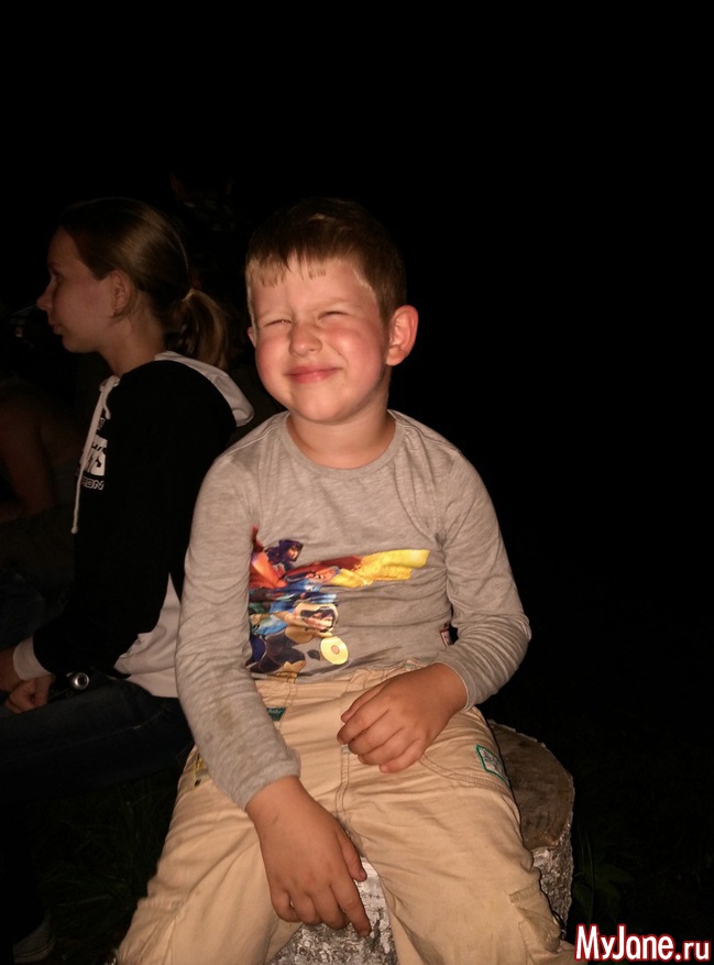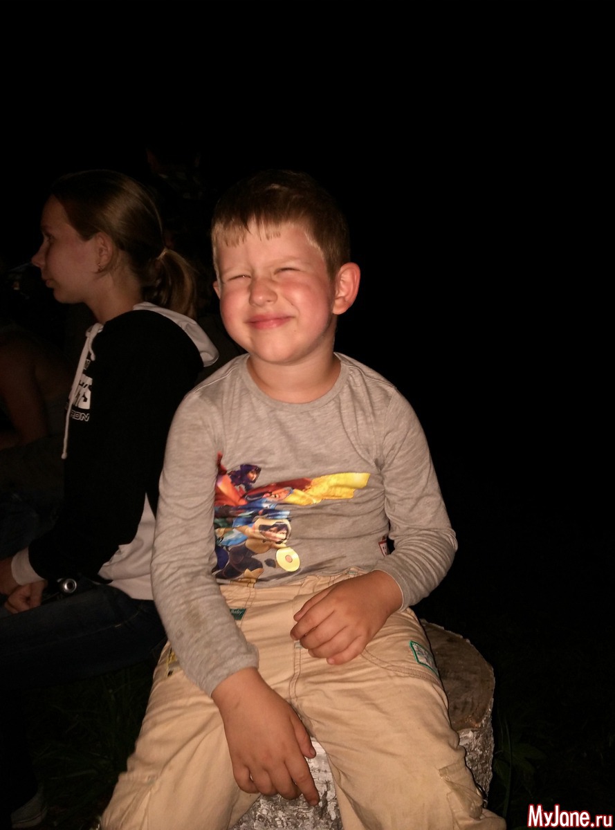 На часах почти два часа ночи. Товарищ вернулся с очередного забега вокруг костра. Сна ни в одном глазу - это он щурится от вспышки