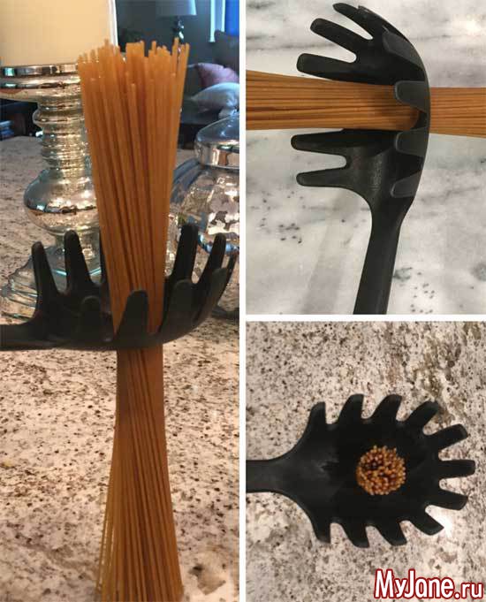 С ее помощью можно решить одну нелегкую задачу: правильно отмерить количество спагетти! Да-да, именно так. Отверстие показывает, сколько нужно взять спагетти для приготовления одной порции среднего размера. Это очень удобно, если вы хотите приготовить еду на один раз, чтобы не оставалось, или боитесь приготовить слишком мало.