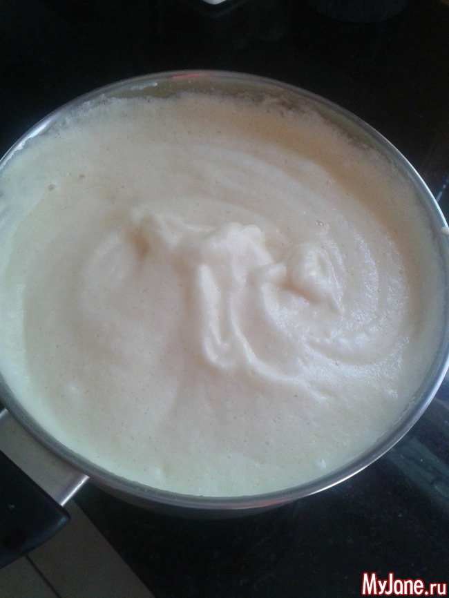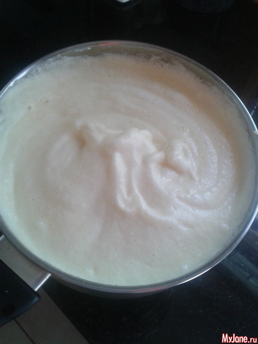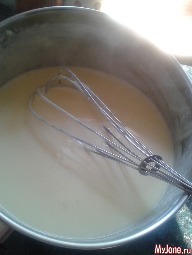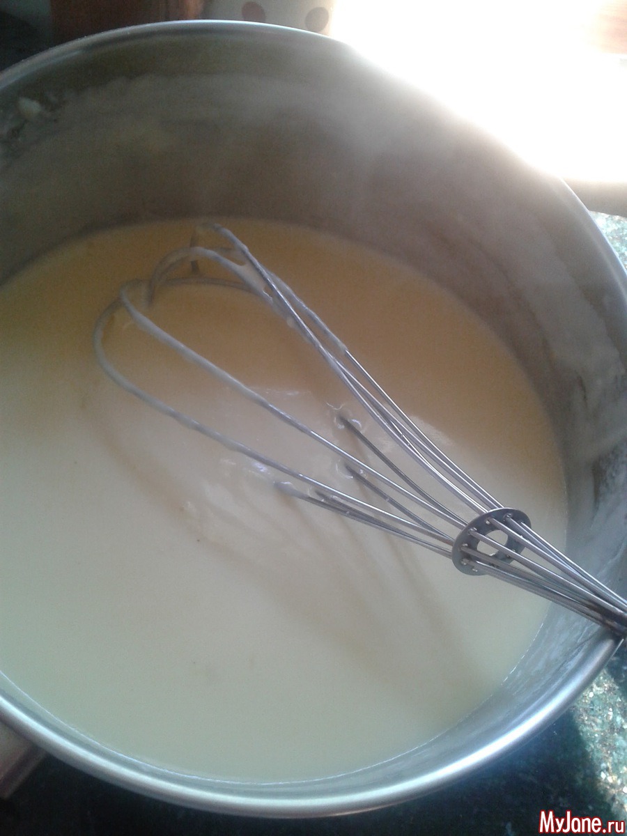 4. Далее ответственный этап приготовления сырной основы. Для тех, кто хотя бы раз делал соус бешамель, это не составит особого труда. Итак, ставим кастрюлю на маленький огонь, кладем туда масло. Когда масло растопится, потихоньку всыпаем муку, а затем вливаем тонкой струйкой молоко, постоянно размешивая венчиком, чтоб не было комков. Затем добавляем туда сыр и мешаем пока не получится однородная, блестящая, густая масса. На последнем этапе тонкой струйкой вливаем желтки, хорошенько размешивая все, чтоб яйца не успели сварится. Все, соус готов, отставляем его в сторону, чтобы остыл.