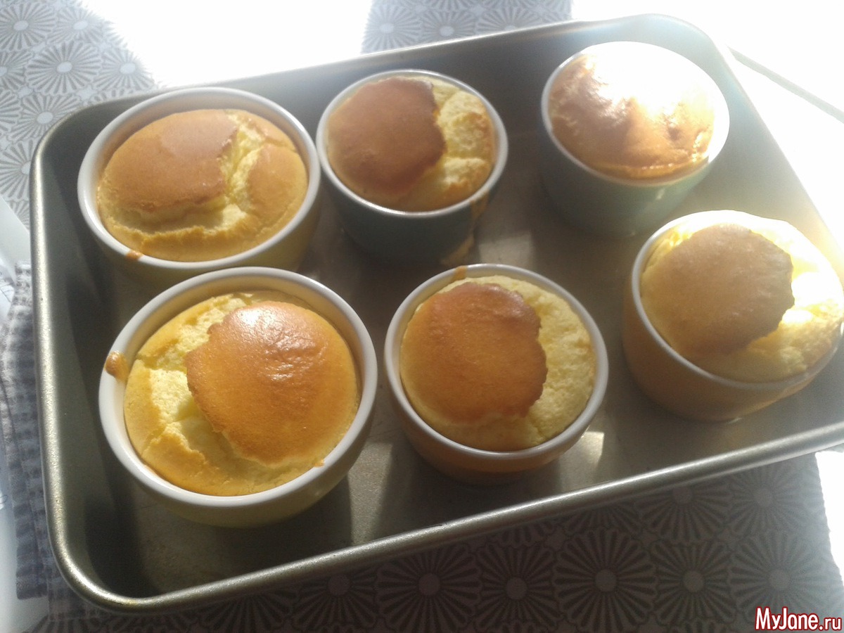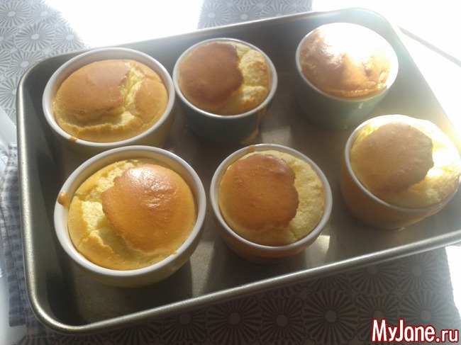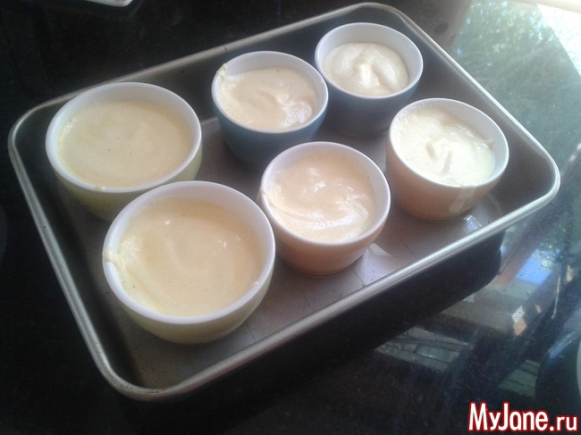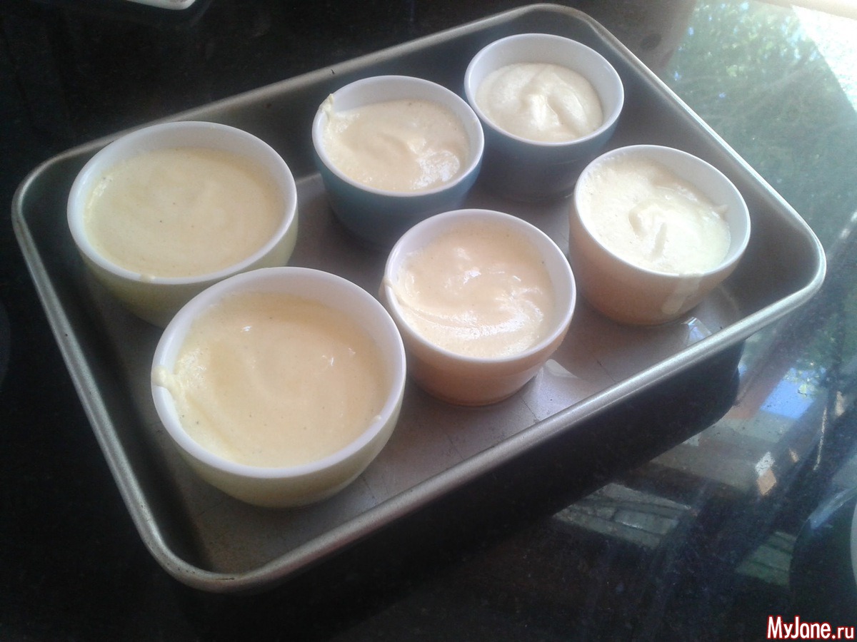 6. Разливаем суфле в заранее подготовленные формочки, ставим их в большой поддон. На дно поддона надо налить немного воды. При таком способе запекания суфле легче вынимать из формочек.