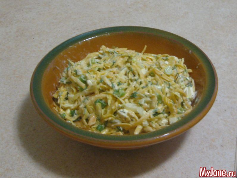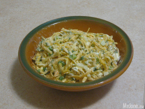 Итак: тыкву трем на бурачной терке. Туда - головку репчатого лука (в рецепте - красный лук, но у меня - обычный), зелень (у меня только укроп был), зеленый лук (немного), я еще чуть-чуть брынзы добавила, посолила, поперчила, добавила 2 чайные ложки хрена (готового, магазинного) и 2 ст.ложки майонеза.