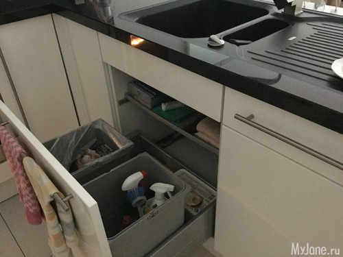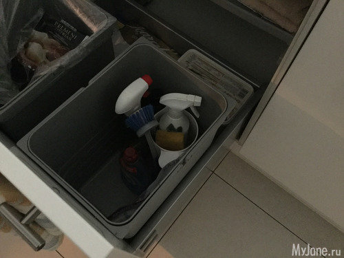 Я не люблю когда все на виду, поэтому чисто из эстетических соображений убираю все с глаз. Стоит внизу под мойкой - там моющее для плиты - я её сразу после использования каждый раз мою, таблетки для посудомойки, тряпка, губка, щётка и средство. (Сори за мусорный бак)