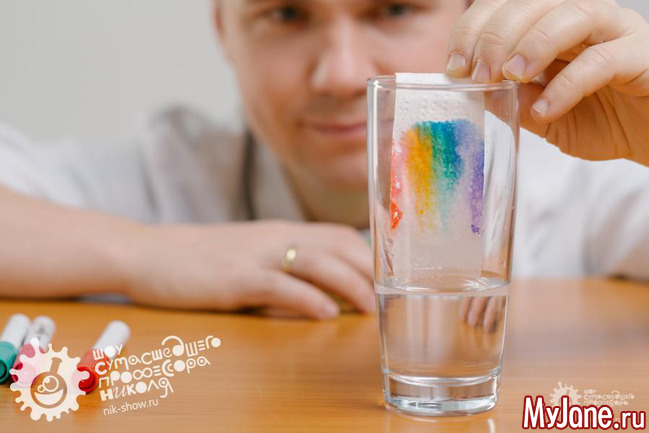 • краска начинает подниматься вместе с водой вверх и получается радуга! Очень красиво! Ура!