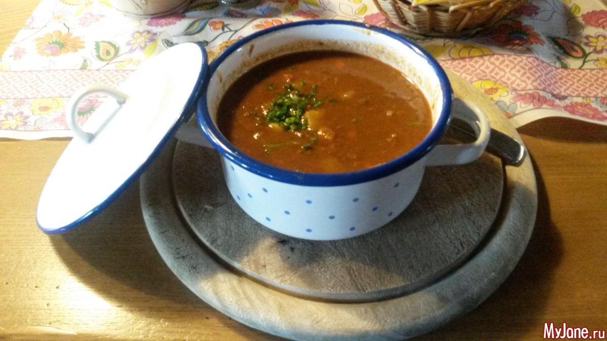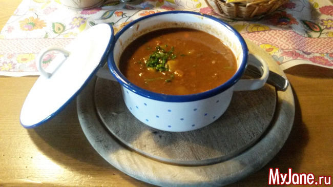 В такой избушке мы заказали себе суп-гуляш с говядиной, который нам принесли не в тарелке, а вот в таких маленьких кастрюльках. Прелесть, правда?