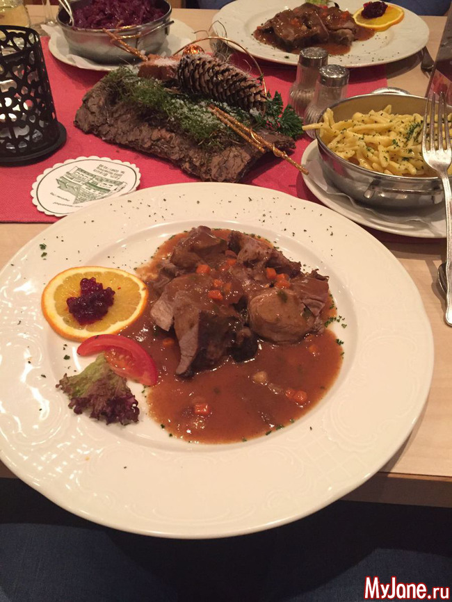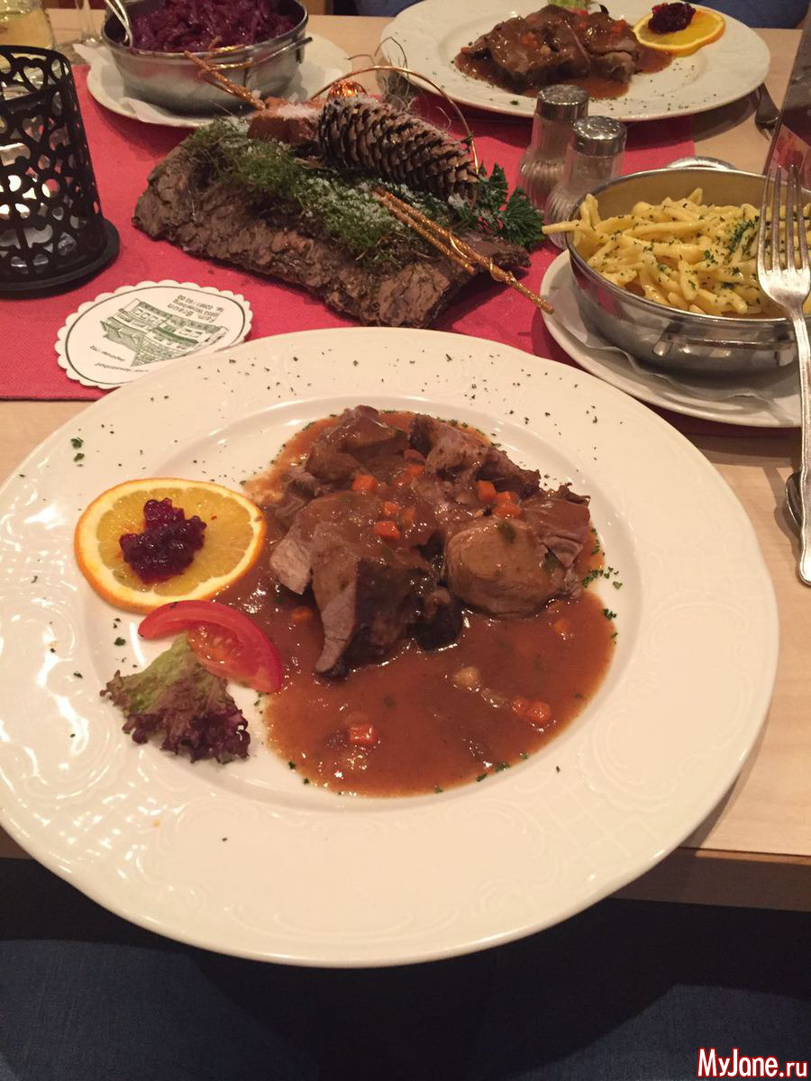 А вечером мы спустились в ресторан отеля, где нас ожидал ужин - суп (картофельный), горячее (дичь с краснокочанной капустой и самодельными шпетцле) и банановый крем на десерт.