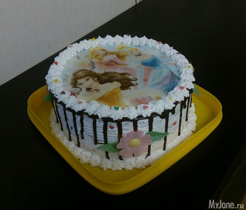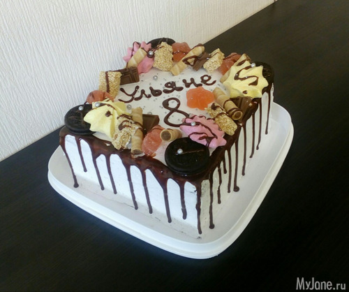 Захотели такой же как у Даши моей был. Но внутри торт, который пекла впервые. Обычно я так не делаю, сначала пробую сама, потом пеку для других. Но тут почему-то осмелела, хотя сейчас сомневаюсь, что сделала правильно. Торт "Колибри" с ананасами. Отзывы в инете разные, и хвалебные и не очень. Залила обрезки сливками, попробовала... вроде ничего, но шоколадный по мне лучше. Я вообще люблю все шоколадное, наверное поэтому этот не смогла оценить.