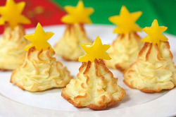 По готовности, испечённые картофельные ёлочки переложить из противня в отдельную плоскую посуду и пока горячие насадить на их кончик нарезанные звёздочки из сладкого перца.