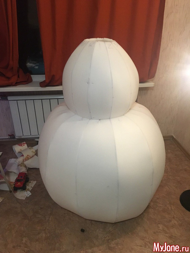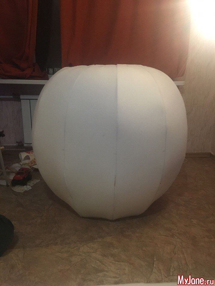 Мерки снимала с подружки с ростом 175 см - средний мужской рост, верно? Нижний шар диаметром 1 метр, средний - 50 см, верхний - 30 см. Косяки начались с того, что я гениально рассчитала длину окружности шара диаметром 1 метр. Ну это же логично, два метра, что тут думать? Купила 1 лист толстого поролона на низ и 1 лист тонкого, на середину и на верх.