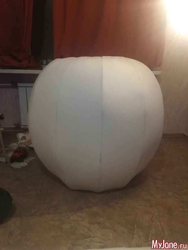 Ладно, делаю раскрой и понимаю, что тут что-то не так. Мне явно не хватает поролона, хотя я делаю немного внахлест, чтобы выкроить одну большую деталь и склеивать у нее края. Тут приходит Миша. Я спрашиваю про длину окружности шара диаметром метр, он сходу, не думая, говорит: "3 метра 14 сантиметров". C = 2πR, школьный курс геометрии, диаметр умножить на число π.