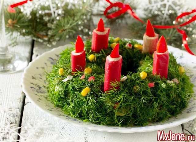 Вырезаем из отложенных крабовых палочек треугольнички и вставляем их в наши свечки из сыра.
