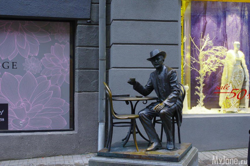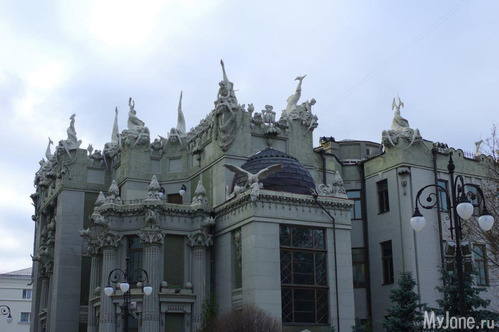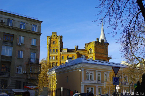 Дом с химерами Владислава Городецкого. Слева администрация П. Порошенко и поэтому там всё очень строго, нас еле пропустили. Сзади от фото стоит полный автобус со спящими солдатами в полной боевой готовности, который мне сфотографировать не дали.