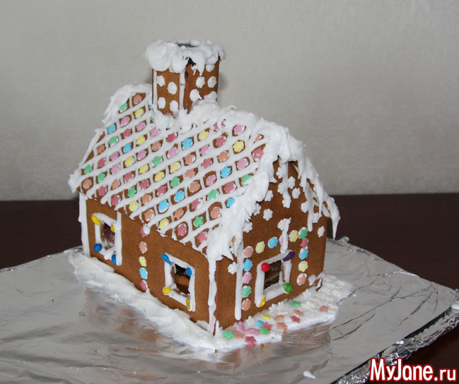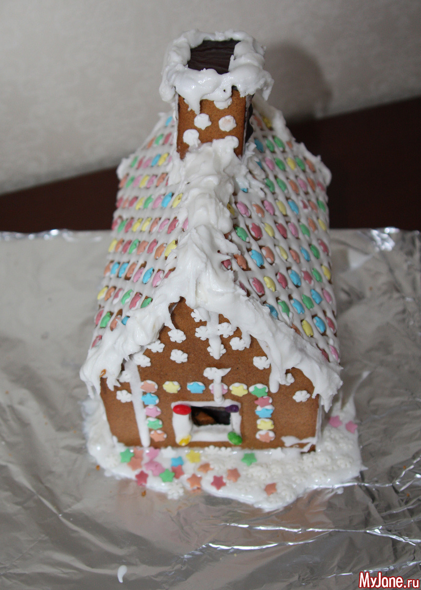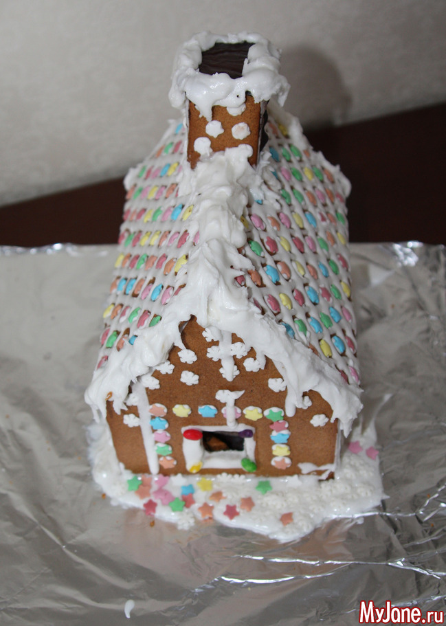 Далее для крашения потребуется фантазия и сладкое которое попадется вам под руку. Печенье, подушечки для сухого завтрака (из них можно сделать черепицу крыши), Скитлз или любые другие глазурированные мелкие сладости. У меня, например, для украшения окон были семечки в глазури.