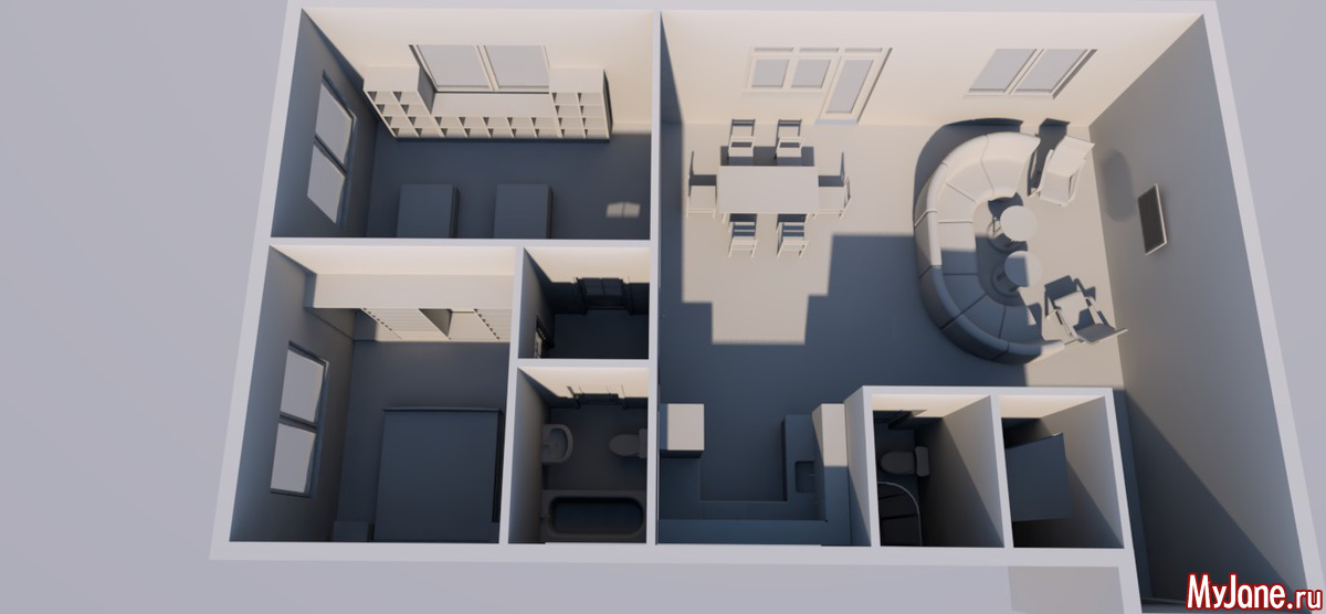 Это пока грубая белая модель с использованием архикадных библиотек, завтра буду делать потолок и красивую визуализацию. Параллельно занимаюсь проектом дома, пока готова только планировка