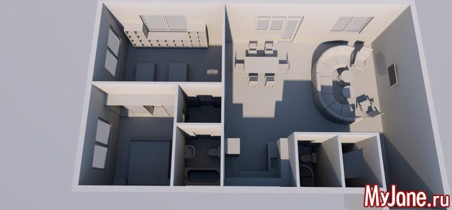 Тогда стенной шкаф будет отгораживать прихожую от кухни-гостиной-столовой, и санузел станет более уединённым.