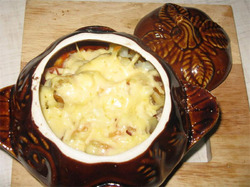 11. Вынув горшочки, снимаем крышки, посыпаем тертым сыром – и еще на несколько минут в духовку, пока не расплавится или даже – если нам так нравится – не покроется румяной корочкой сыр. Без крышек, конечно.