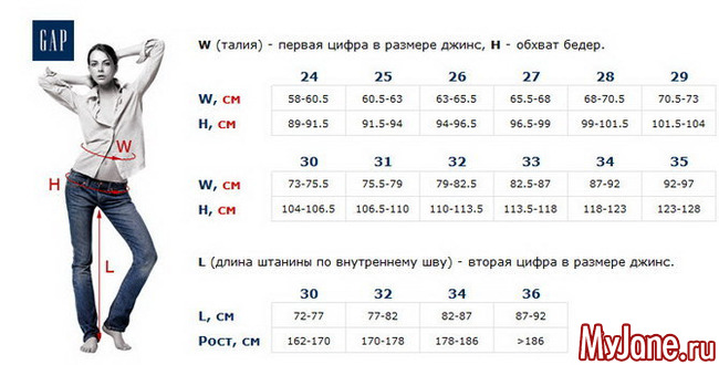 У джинсов своя размерная линейка. На ярлыке указаны две цифры. Первая обозначает обхват талии и бедер, то есть фактический размер, а вторая — длину штанины по внутреннему шву (по ней можно определить, на какой рост джинсы). Чтобы верно определить джинсы, которые тебе нужны, изучи таблицу.