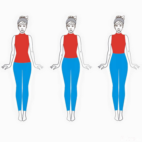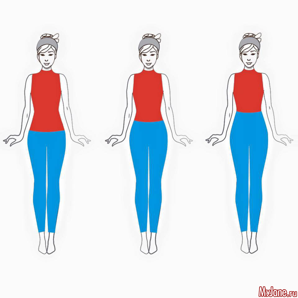 Они не только удлинят верхнюю часть фигуры и "облегчат" объем, но и придадут дополнительный объем бедрам. Обратите внимание, если у вас при этом уже достаточно длинное туловище и короткие ноги, то лучше выбрать вариант 2 (рис.по середине), брюки с заниженной талией акцентируют диспропорцию между длиной туловища и ног. Аналогичные рекомендации могут использовать девушки типа "яблоко". Если вы выбираете джинсы, обратите внимание на этикетке и как правило на внутренней части пояса вы найдете надпись LOW RISE.