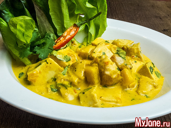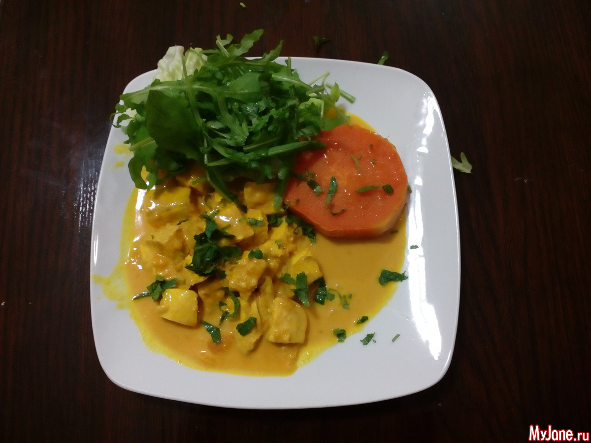 Коронационный цыпленок готов! Подаем, украсив листьями салата и перчиком чили.