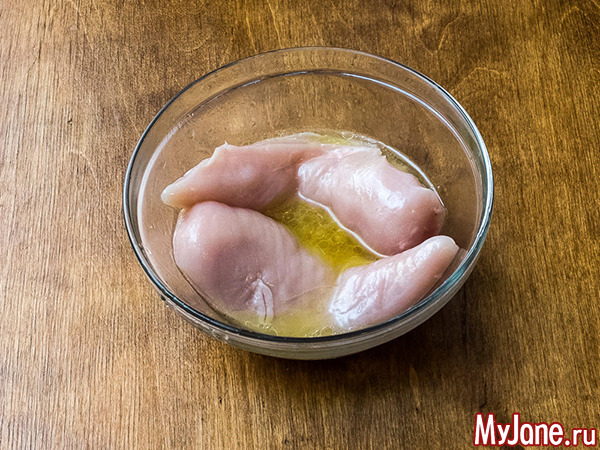 Для начала замаринуем куриные филе в смеси оливкового масла и лимонного сока.