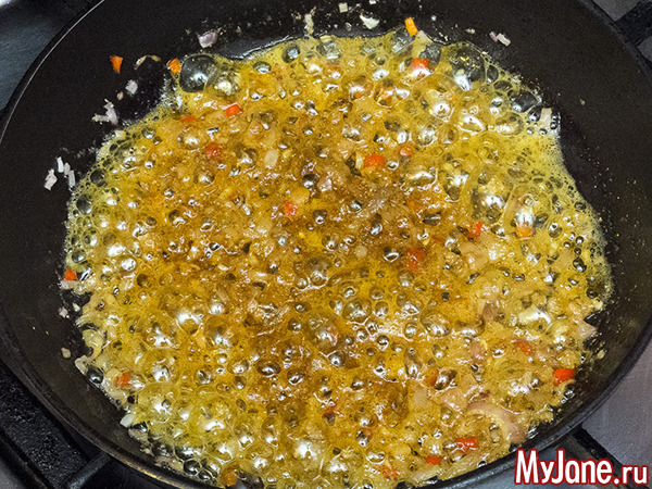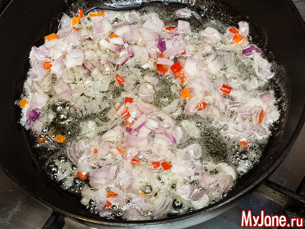 На сливочном масле обжариваем мелко порезанный лук-шалот и чили.