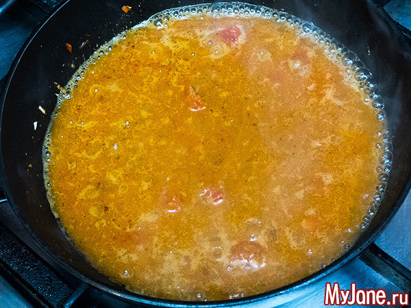 Добавляем томатное пюре и прогреваем пару минут. Добавляем белое вино и увариваем в два раза.