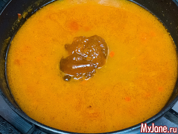Добавляем абрикосовый джем и бульон и продолжаем готовить, пока объем жидкости не уменьшится в два раза.