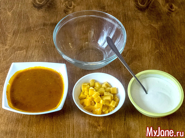 Начинаем готовить заправку (в мисочке посередине – нарезанный кубиком манго).