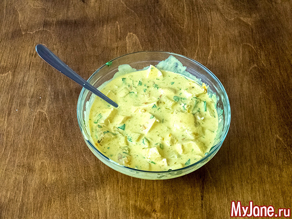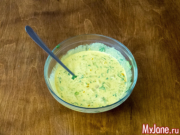 В миске смешиваем абрикосовую заправку, смесь сметаны и майонеза, мелко нарезанную кинзу.