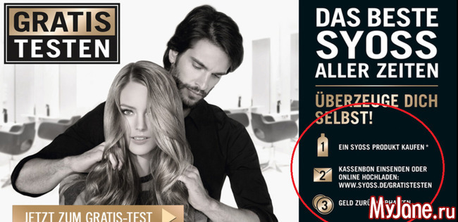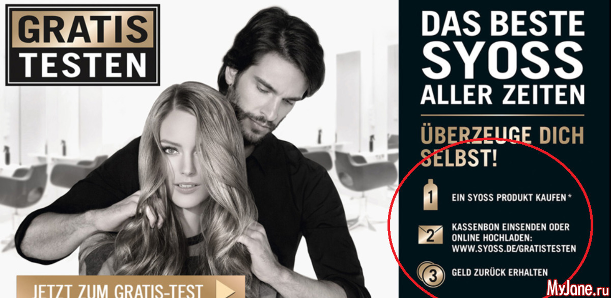зашла на странички производителей (к примеру Syoss, шампунь) и прошла инструкцию (1. Купить продукт, 2. Загрузить фото или выслать по почте чек, 3. Вернуть деньги).